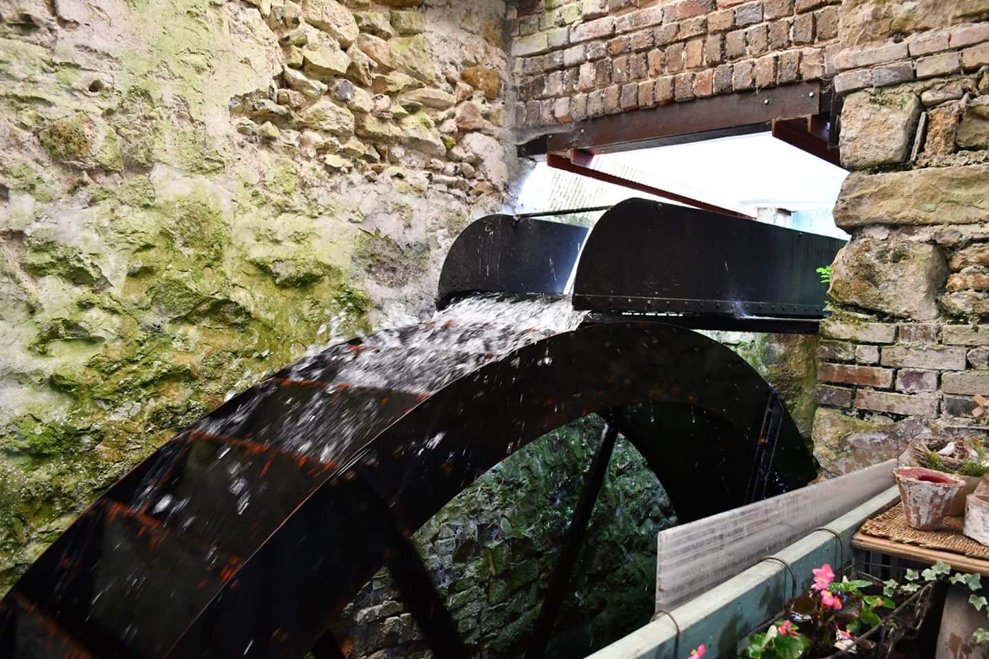 Le trop-plein de la source du ruisseau de Charrault alimente le bief et l’eau, une fois canalisée, entraîne la roue métallique qui fait tourner la meule sur son socle.