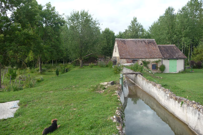 Bief sur le ruisseau accessible ; déversoir, vannage, roue et meule visibles de près.