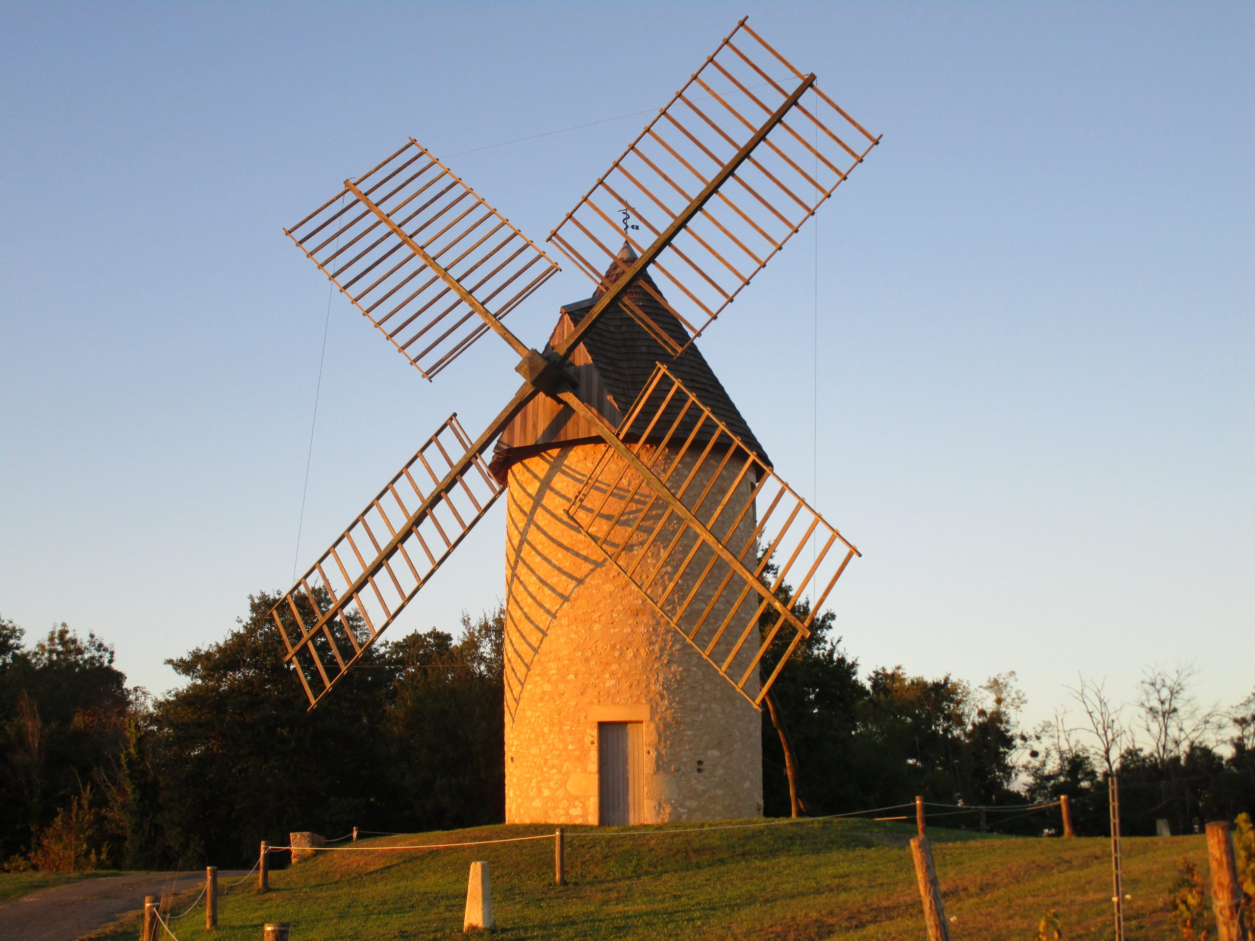 GIRONDE (33) – Moulin à vent trois fois centenaire, restauré en 2002 avec restitution du mécanisme de mouture à une paire de meules en silex, et engrenages en bois.