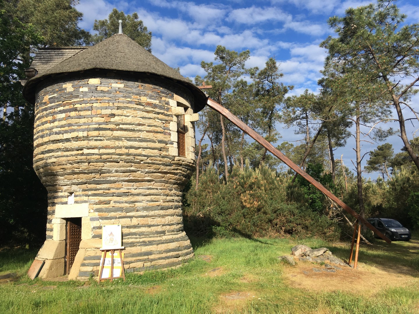 MORBIHAN (56) – Rare moulin a vent dit « A petit pied » ou » en bouchon de champagne » à la structure unique en Bretagne. démonstration de l’usage d’un toit tournant. Explication sur le fonctionnement d’un moulin à vents.