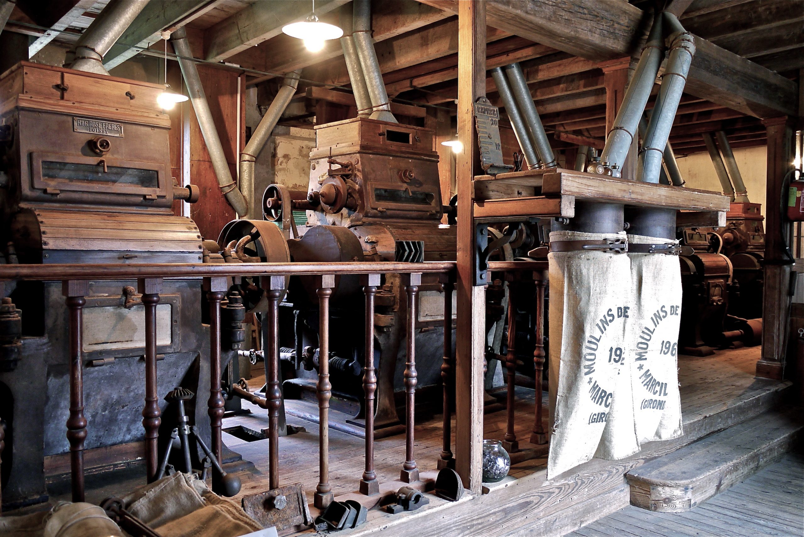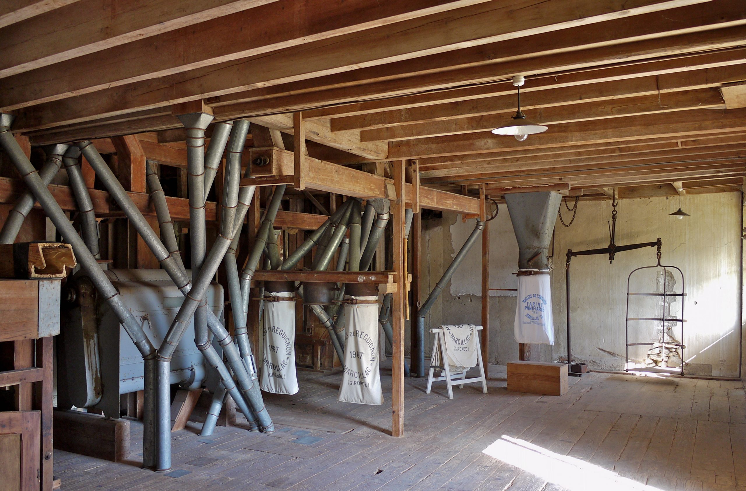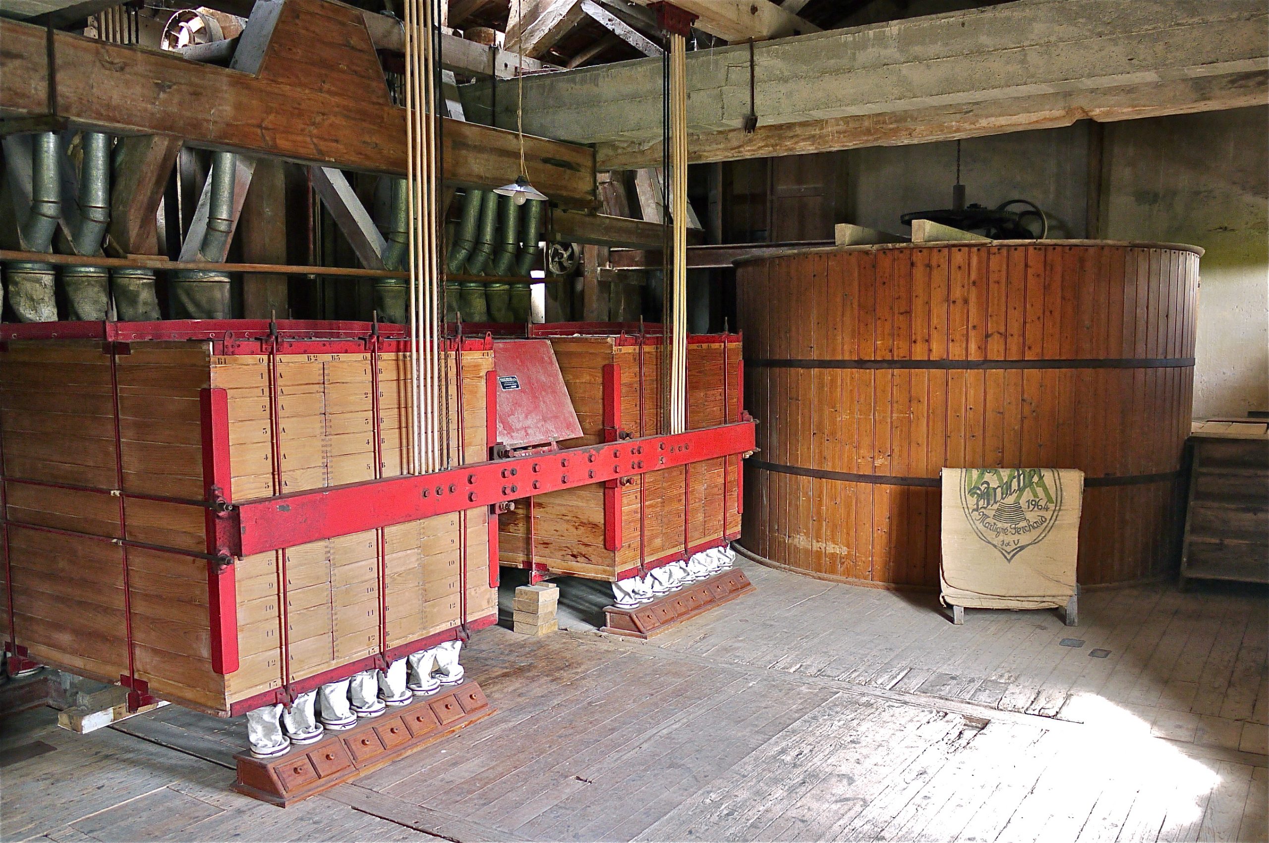 Au sous-sol, l’arbre de transmission et les poulies. Au rez-de-chaussée, alignement de cinq appareils de marque Rose Frères. Aux niveaux supérieurs, brosse à blé, brosse à son, plansichteret chambre à farine.